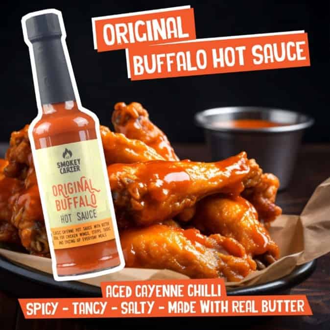 Classic buffalo hot sauce made with aged cayenne pepper and real butter. Tangy, sharp and smooth with a little cayenne chilli kick. The perfect condiment to chicken.