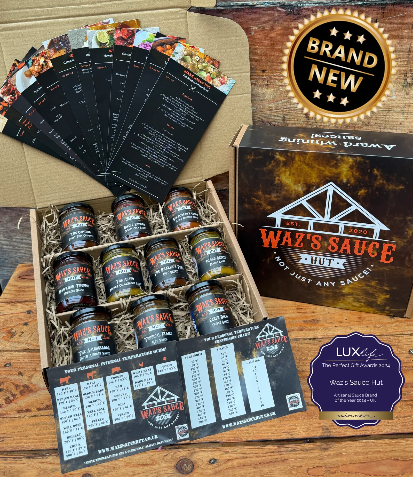 Here’s a kit to help you cook with confidence and creativity. Discover new flavours with Waz’s Sauce Hut’s Gourmet Starter Kit. This set is designed for both everyday cooking and backyard grilling. Inside, you’ll find 10 x 100ml jars of award-winning Waz’s Sauce Hut sauces, 12 easy-to-follow recipe cards, and 2 handy magnets that show internal cooking temperatures for all proteins, plus conversions between Gas Mark, Fahrenheit, and Celsius.