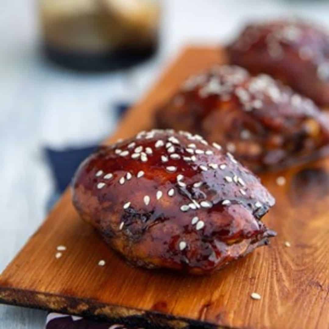 Anything grilled on a cedar plank is fun to eat, but these Asian-style soy ginger marinated chicken thighs are just delicious.